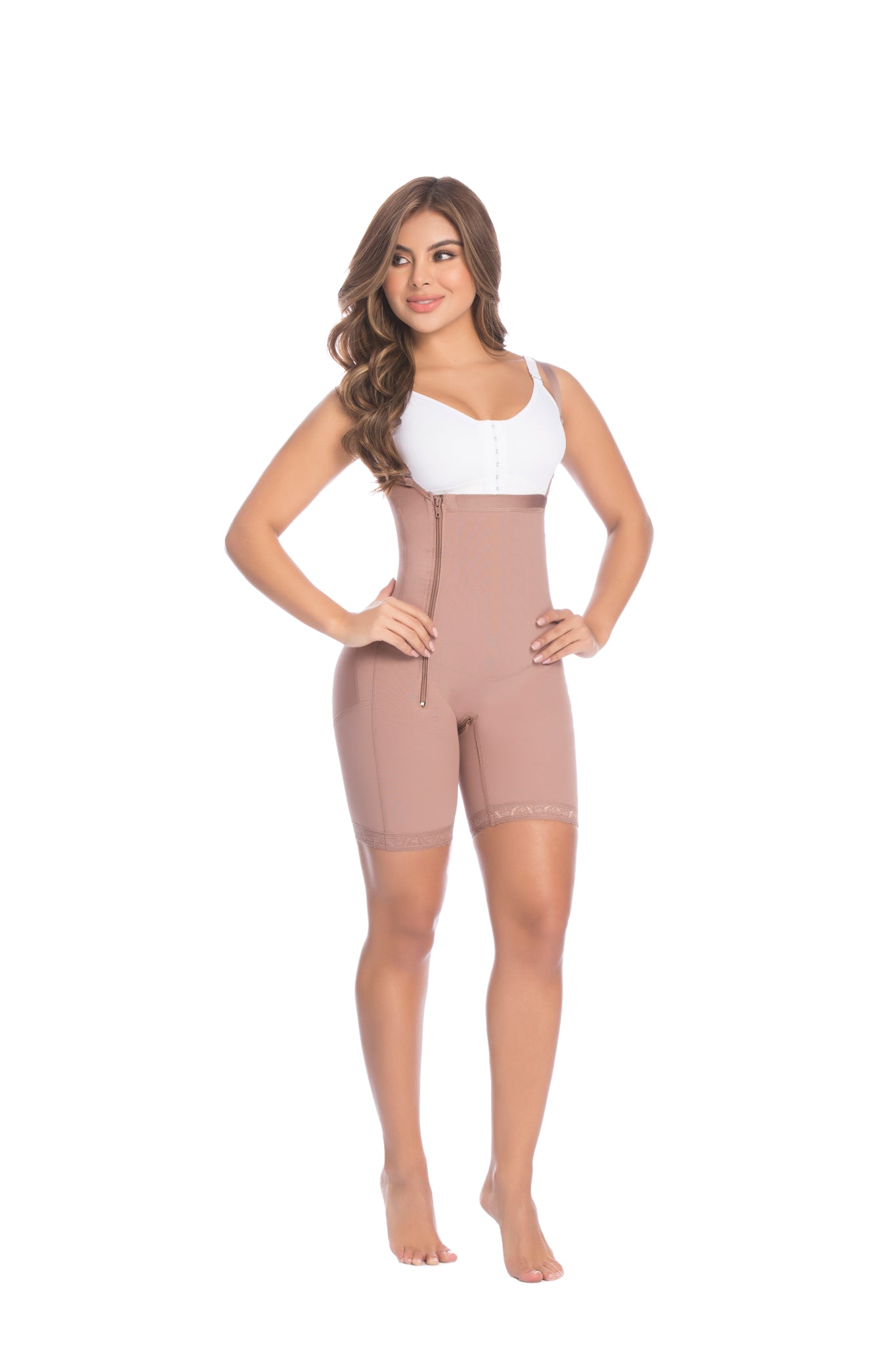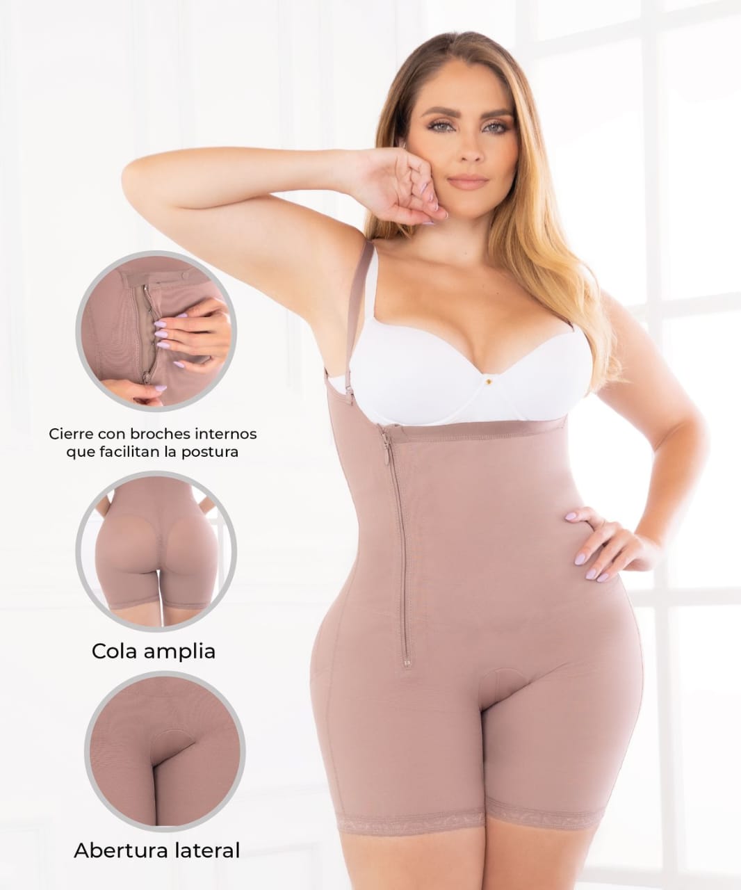 Faja moldeadora postquirúrgica, que ofrece control en los muslos, abdomen, torso y cadera. Cuenta con cremallera lateral, broches internos y es de busto libre, además brinda un ajuste perfecto y ayuda a la desinflamación uniforme. Alivia los dolores de espalda gracias a su cubrimiento parcial en la espalda que beneficia la región lumbar. Cuenta también con doble refuerzo abdominal que brinda una compresión alta previniendo la retención de líquidos, lo que agiliza el proceso de cicatrización y regeneración de tejidos. su diseño hará que tu cola realce y se moldeen los glúteos permitiendo que luzcan más grandes y firmes. Siéntete increíble en todos tus outfits utilizando tu faja favorita.